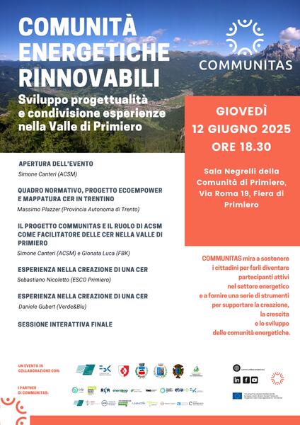 Nell’ambito del progetto europeo “Communitas” si terrà il giorno giovedì 12 giugno 2025 ad ore 18.30 presso la sala Negrelli della Comunità di Primiero sita in via Roma 19 a Tonadico un evento pubblico dal titolo “Comunità energetiche rinnovabili – Sviluppo progettualità e condivisione esperienze a Primiero”.